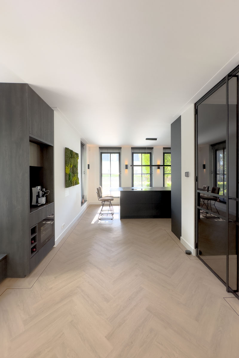 Interieurontwerp voor de verbouwing van een woning in Amersfoort. In dit project zijn keuken, maatwerkoplossingen, stalen schuifdeuren en een nieuwe indeling toegepast om de woning lichter, ruimtelijker en eigentijdser te maken.